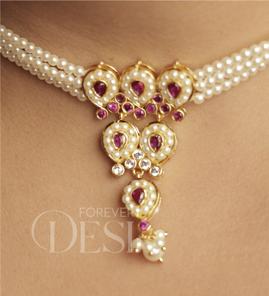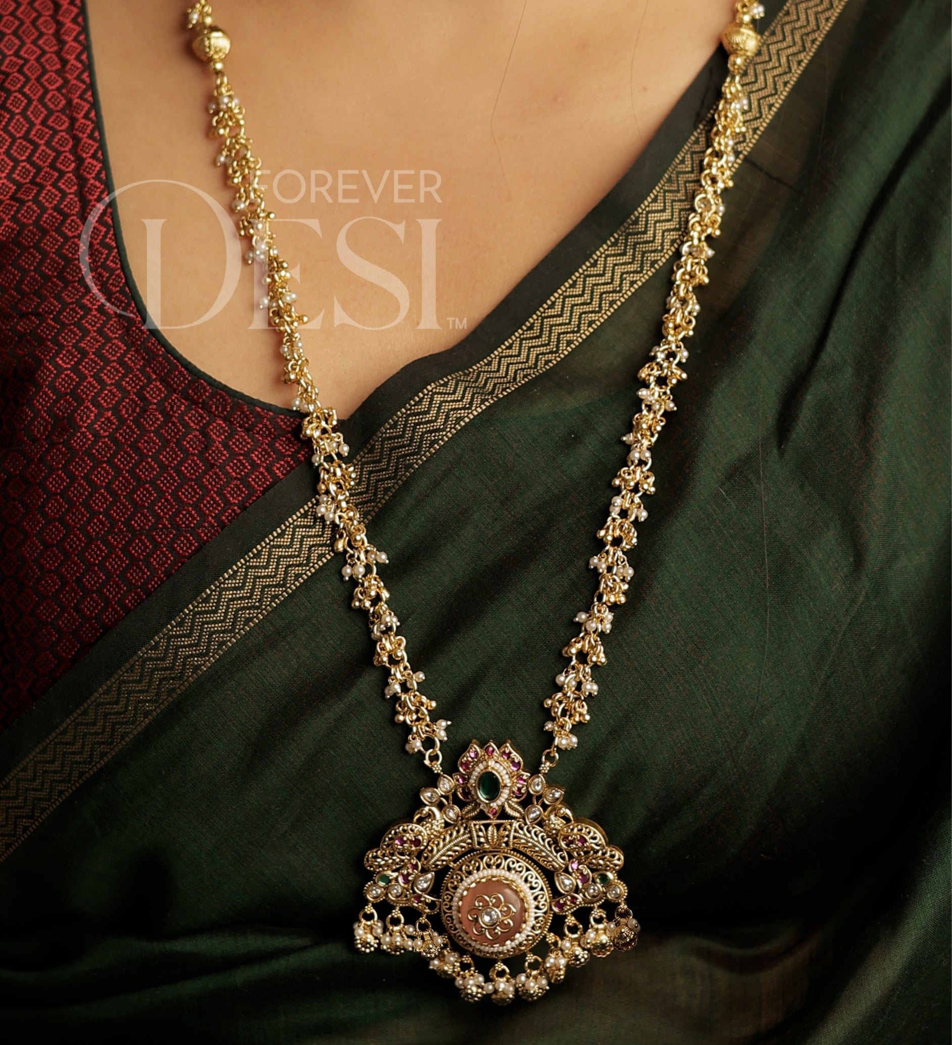 "The perfect mix of bold and elegant! The Kolhapuri details and Mohan Maal pearls complement each other beautifully."