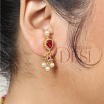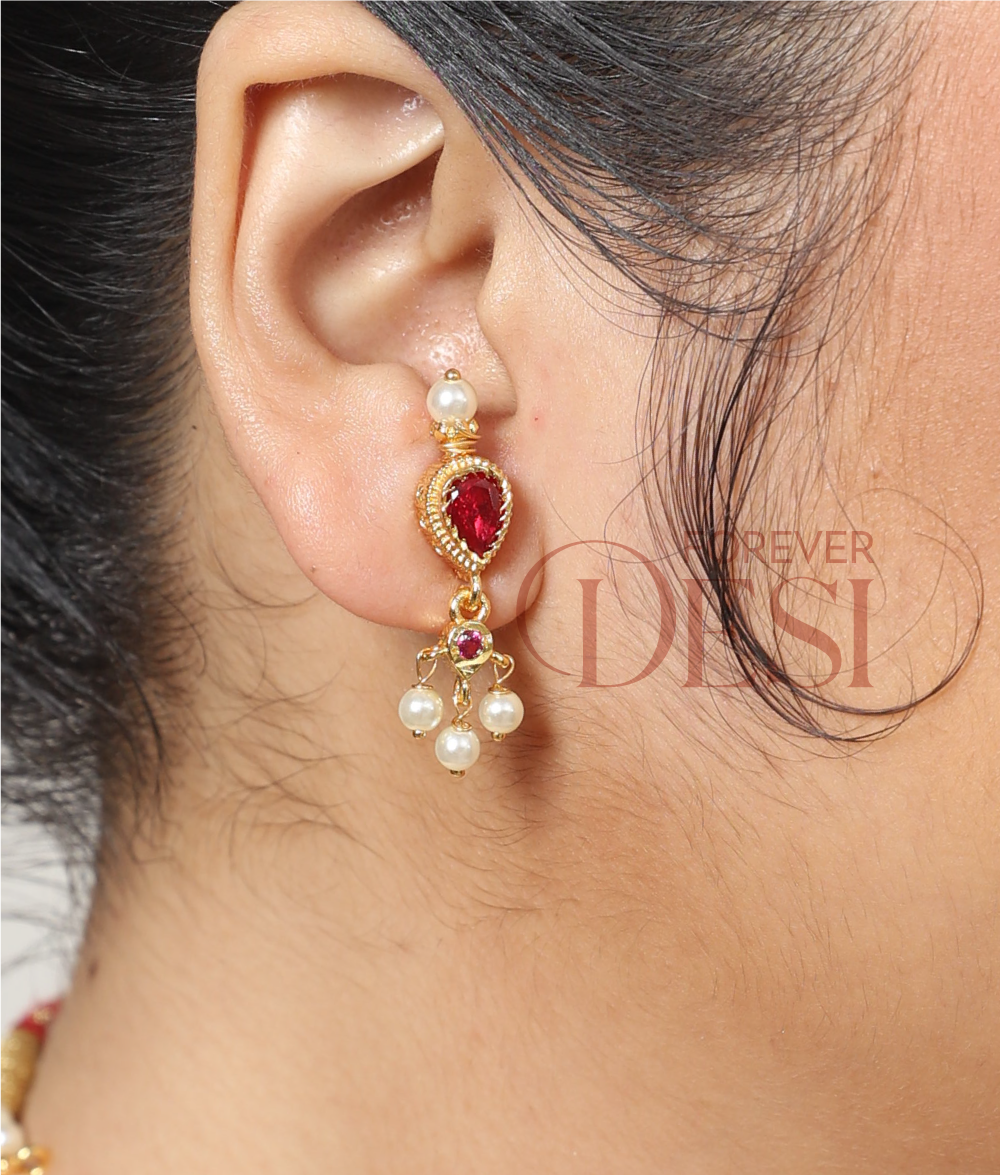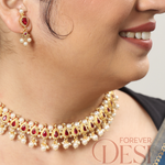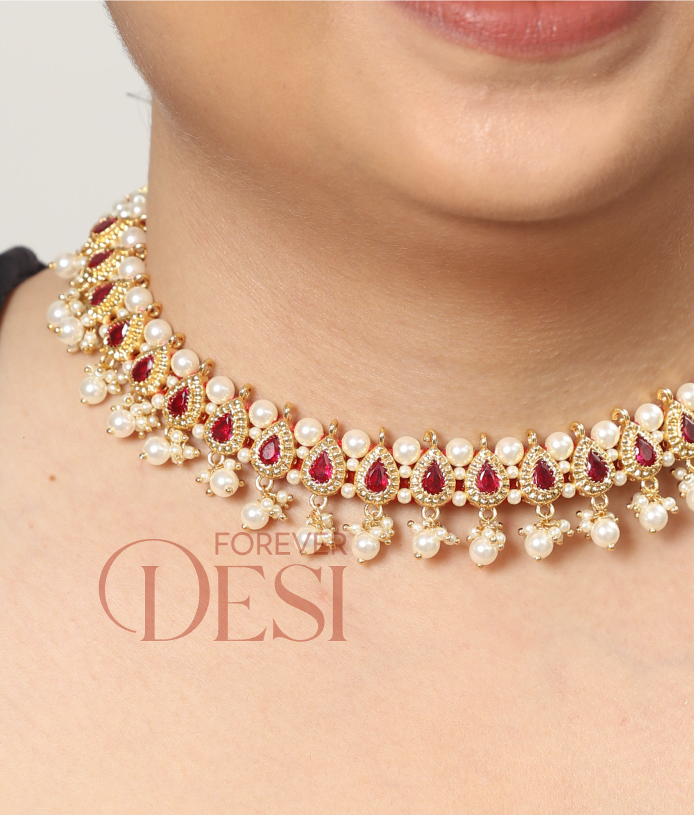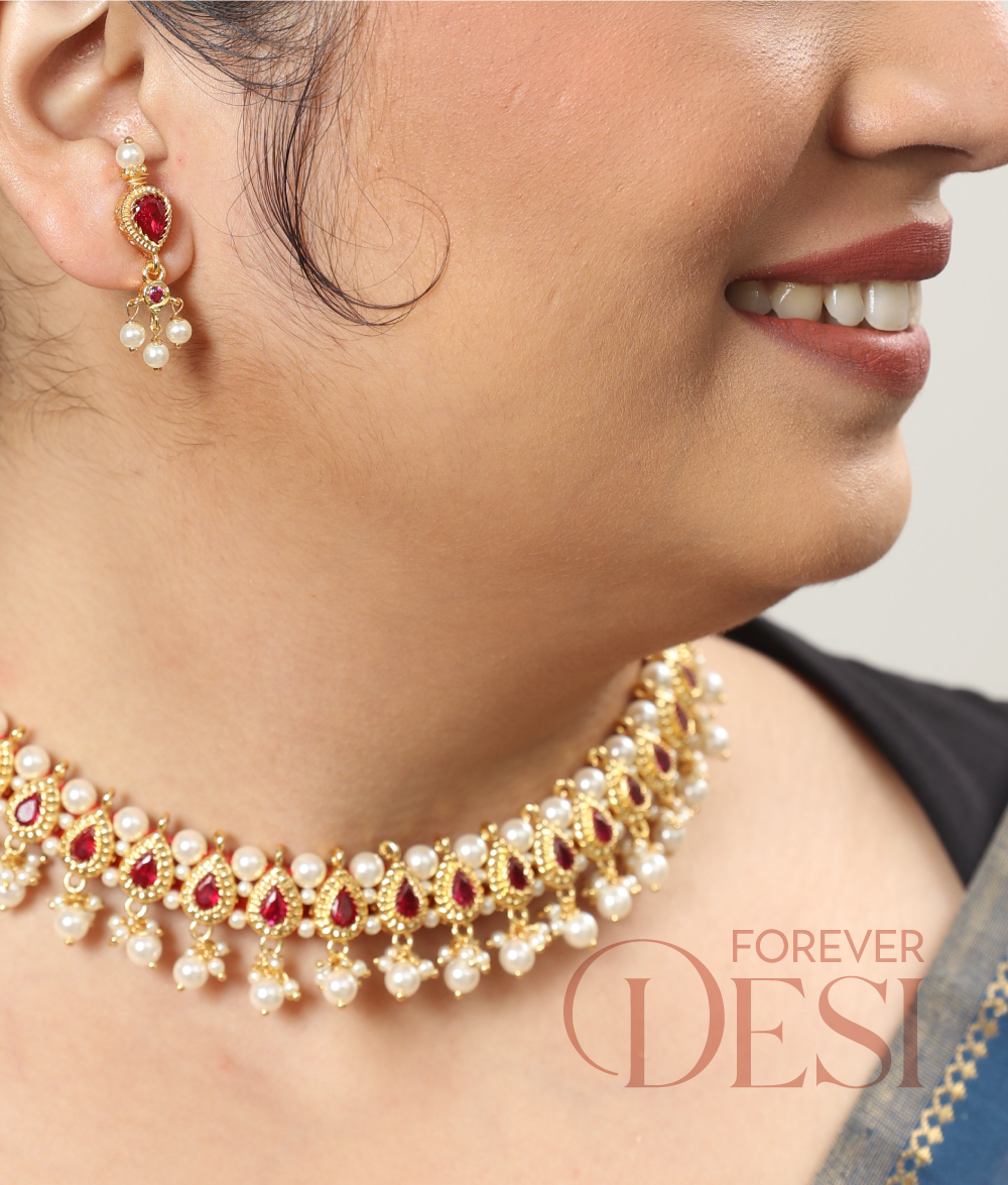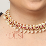 A stunning chinchpeti style choker crafted with intricate almond-shaped red motifs, highlighted with pearl detailing and paired with matching earrings. Perfect for traditional Maharashtrian and festive looks.