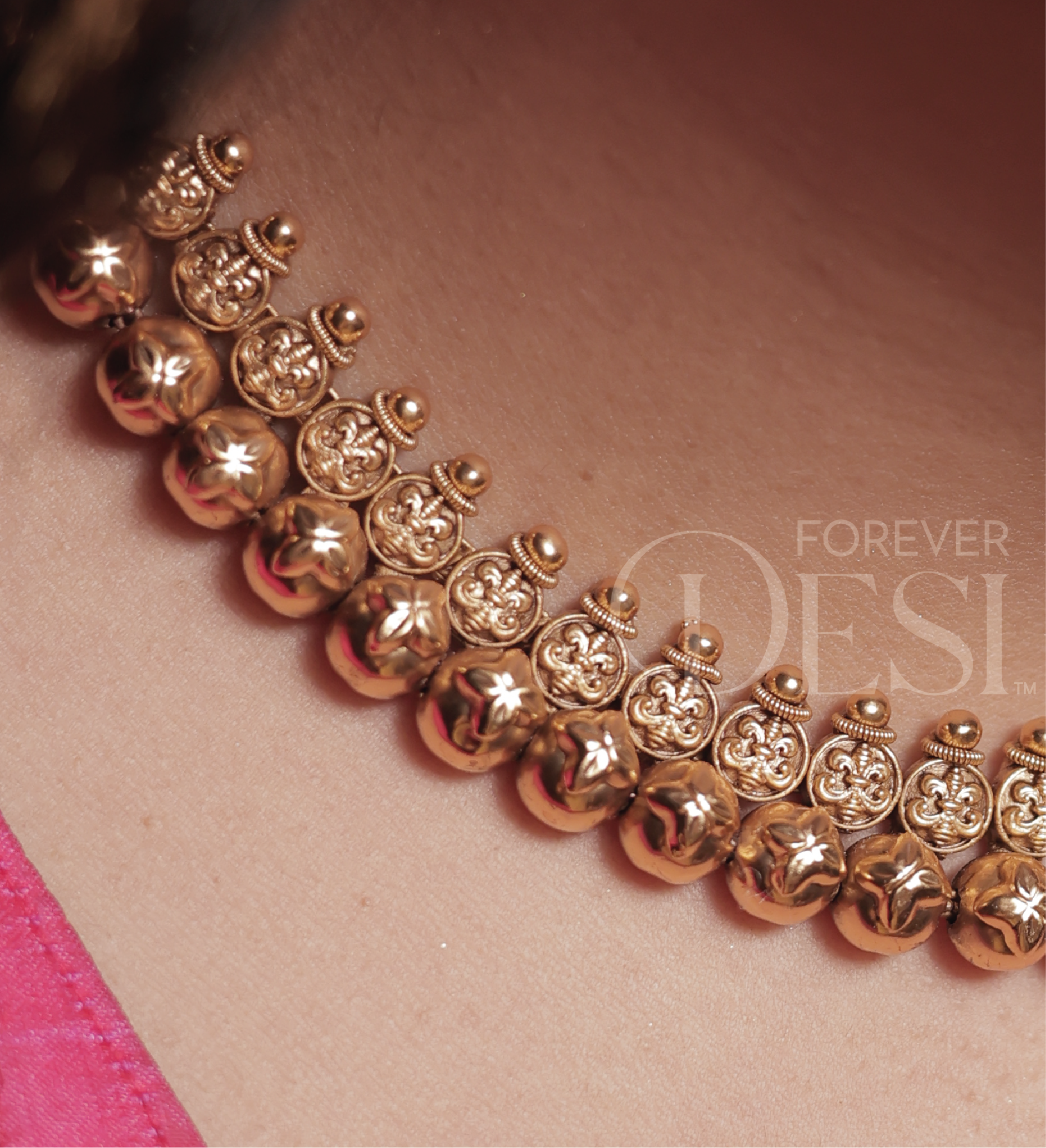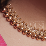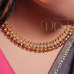 A classic Maharashtrian thushi necklace crafted in an antique gold finish, featuring finely detailed paisa motifs paired with traditional ghungroo-style beads. Rich, bold, and beautifully structured, this thushi sits gracefully on the neckline—perfect for weddings, festive looks, and traditional sarees.