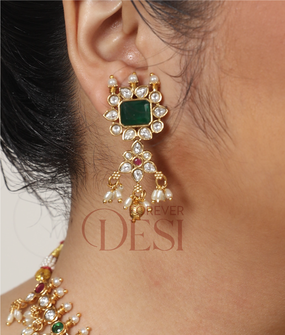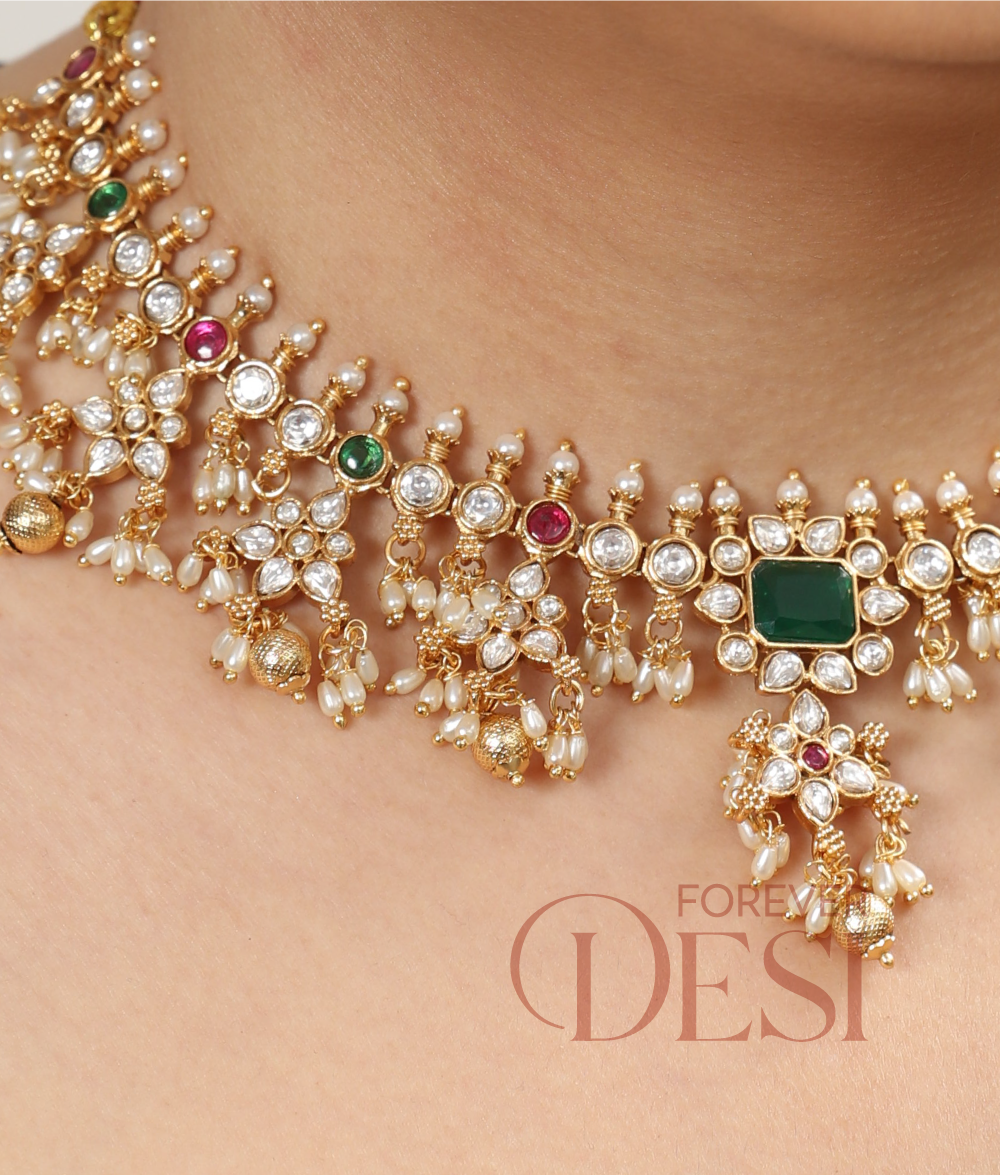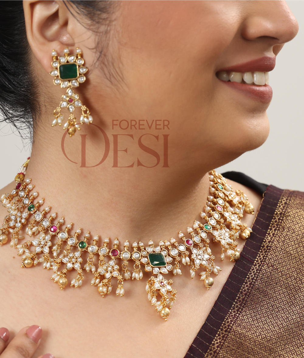 The Short Aaranya Polki Set is an exquisite masterpiece, featuring intricate floral motifs adorned with shimmering pearls, emerald-green stones, and vibrant ruby accents. The delicate craftsmanship, paired with matching earrings, makes this set perfect for weddings, festive occasions, and grand celebrations. Add a touch of elegance and timeless charm to your jewelry collection with this radiant design.