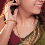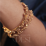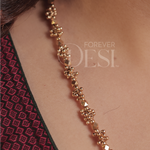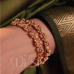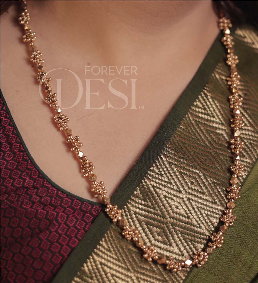 Ashta Ghugri Mala Set and Tode Combo features eight delicate ghugrees symbolising auspiciousness and prosperity. Finished in premium antique gold polish, it adds a graceful traditional charm—perfect for weddings, festive wear, and cultural occasions.
