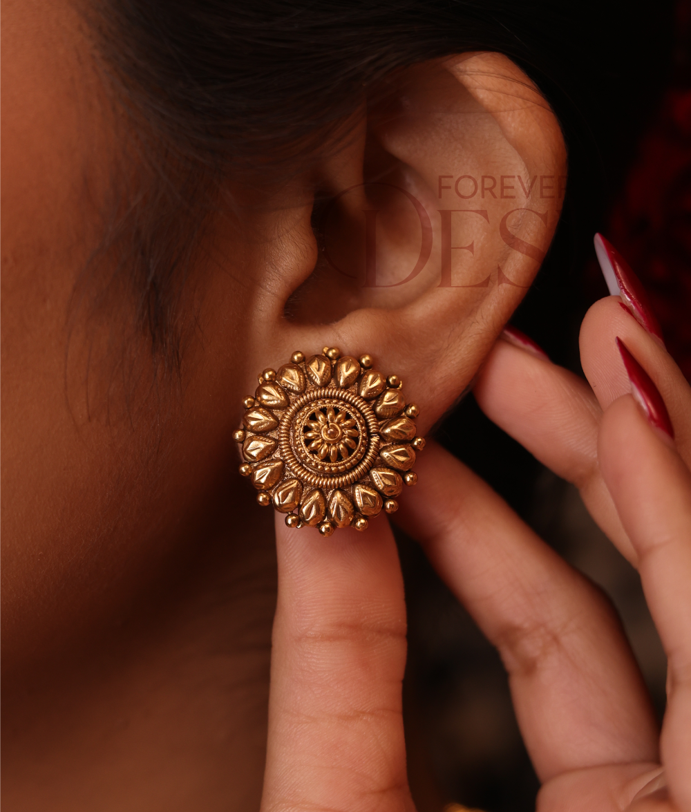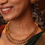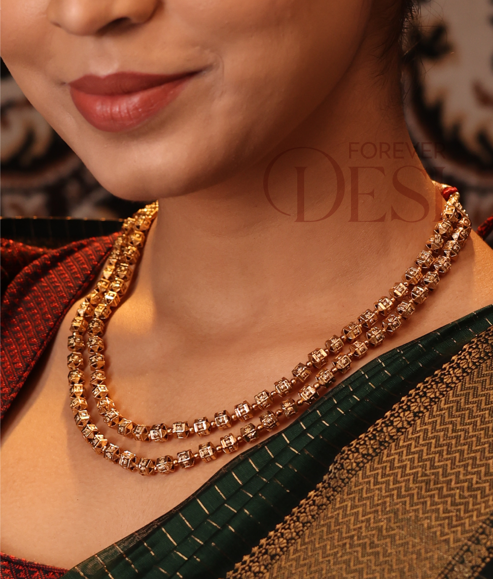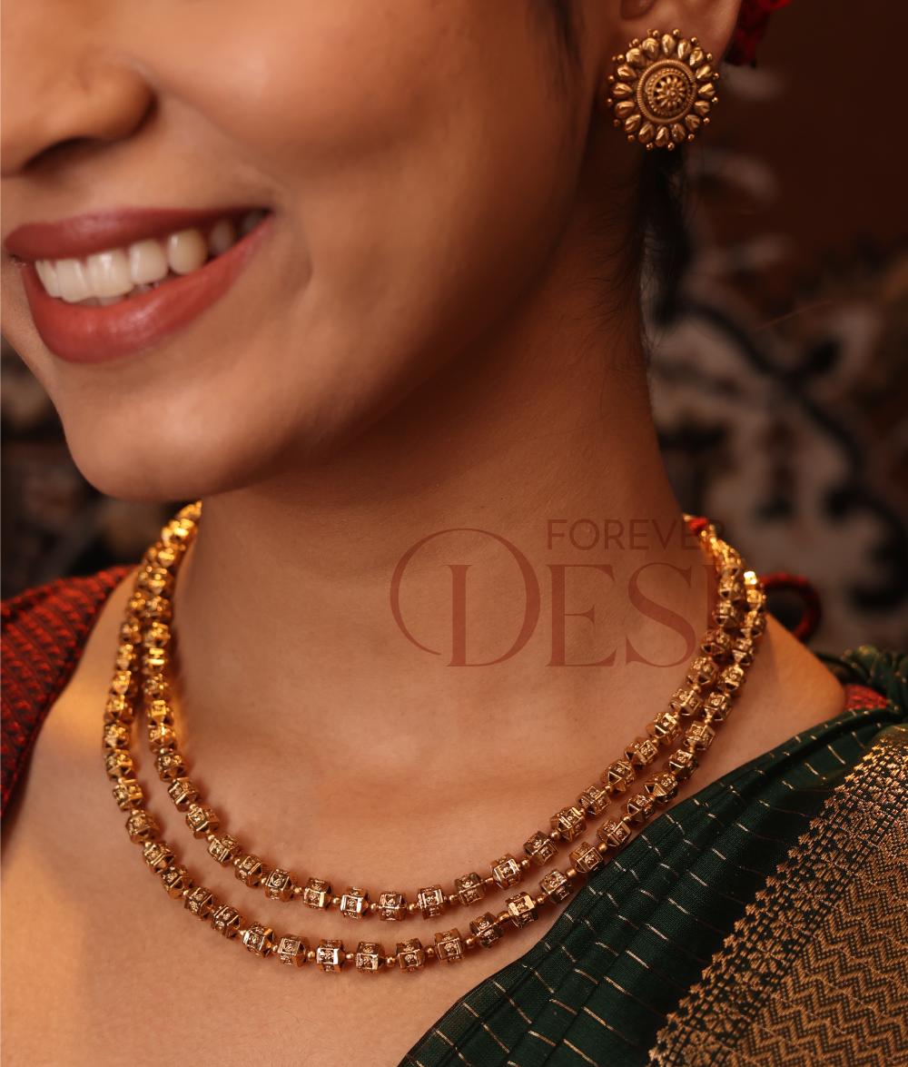 A timeless design featuring distinctive square-shaped beads (chaukoni moti) arranged in elegant double layers. Crafted in premium gold-plated brass, this lightweight yet statement necklace captures the authentic charm of traditional jewellery. The matching earrings add a graceful finish, making it perfect for festive wear, temple visits, or pairing with your favourite silk sarees.