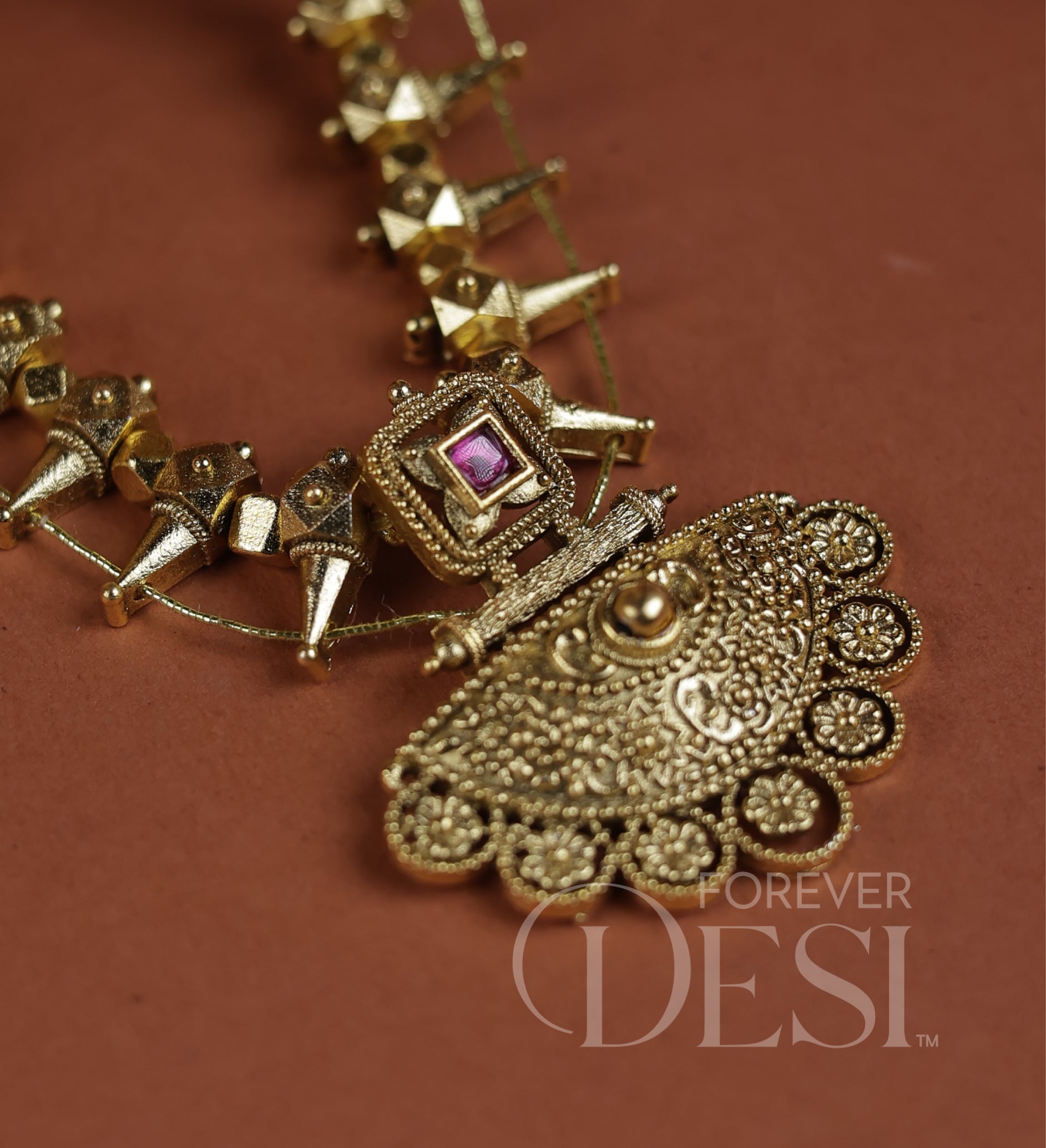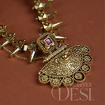A beautifully crafted Ashata Saaj necklace inspired by traditional Maharashtrian Saaj. Designed with delicate geometric elements and an intricately detailed pendant with a ruby-toned accent, this piece reflects timeless elegance and heritage.