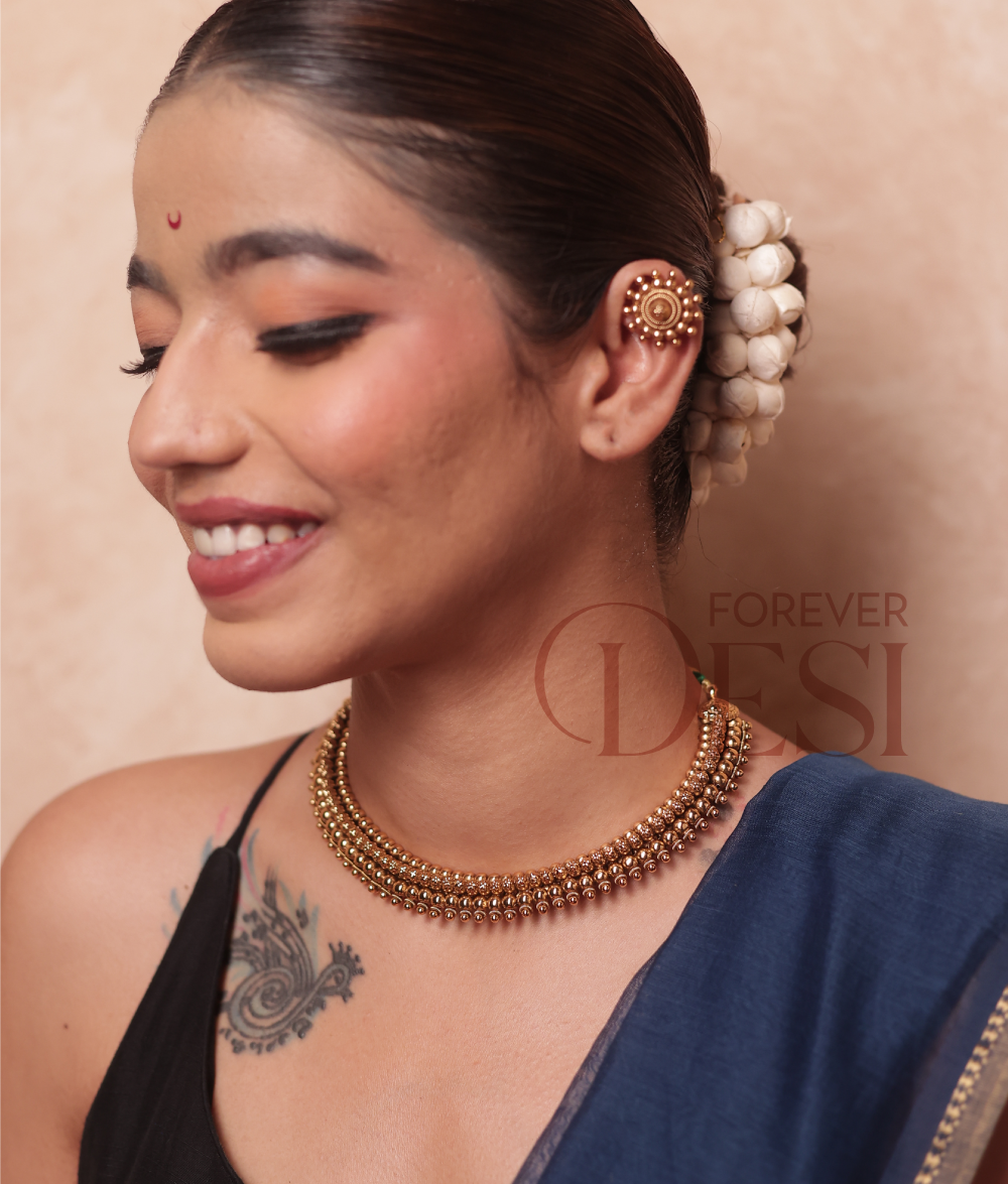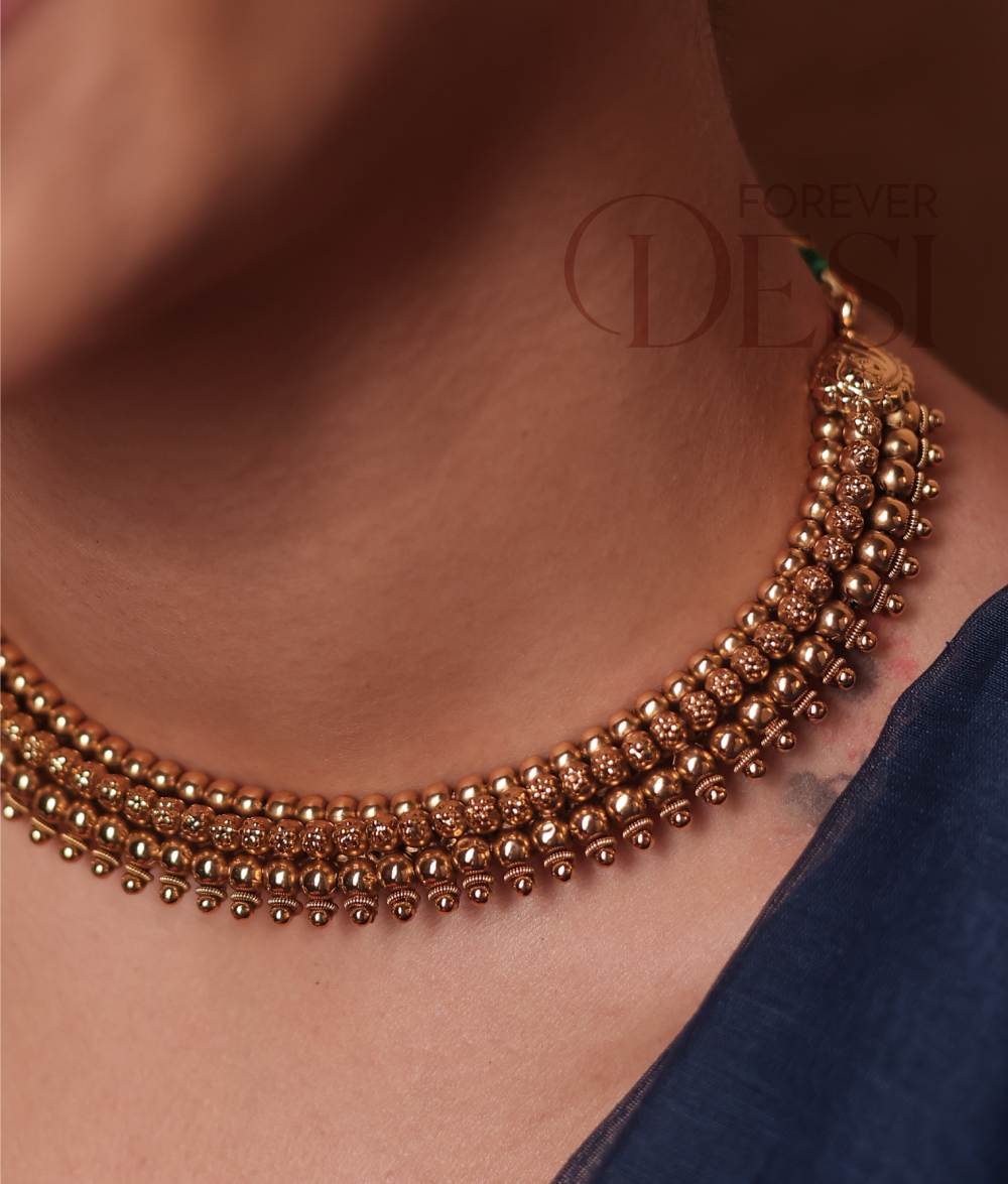 The Round Beaded Rajwada Thushi Choker captures the essence of Maharashtrian beauty in its signature dome-shaped golden beads. Each bead is perfectly handcrafted and strung close to form that classic Thushi pattern — tight, elegant, and full of traditional charm. A piece that sits gracefully on your neck and instantly gives that festive, royal look.
