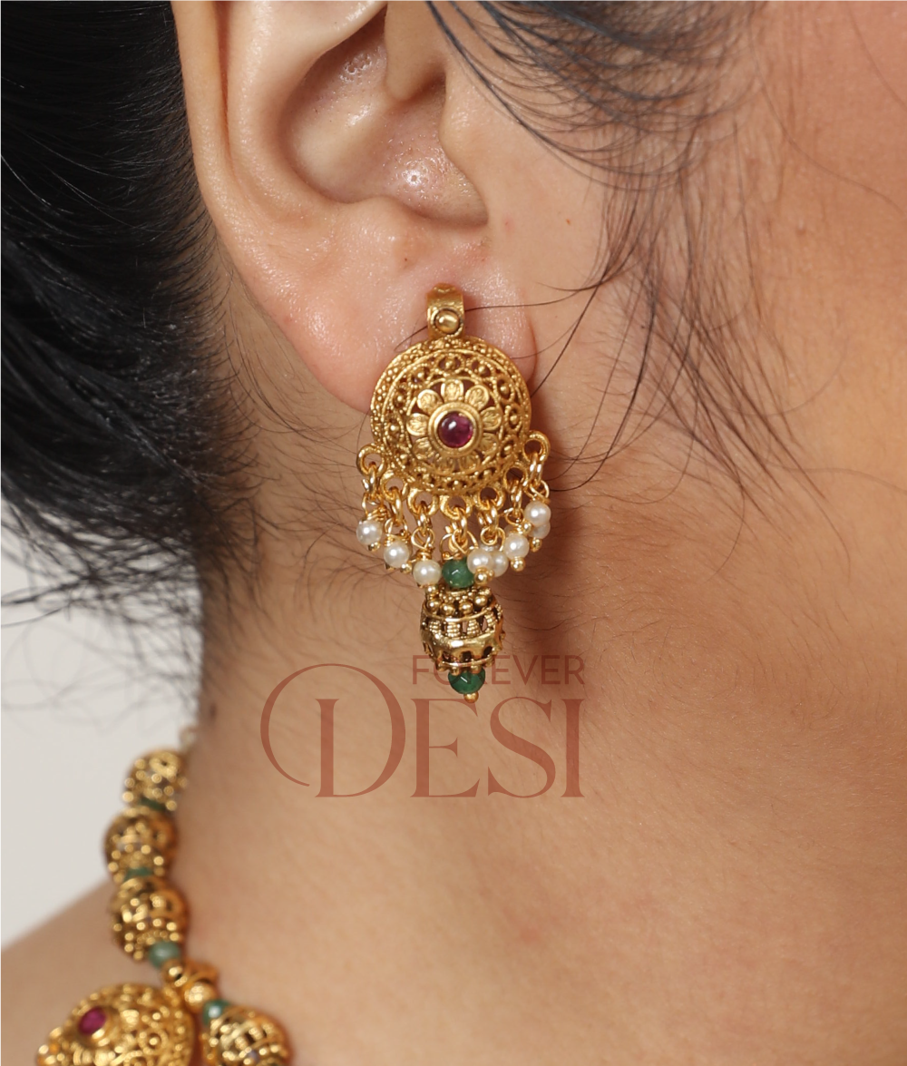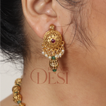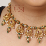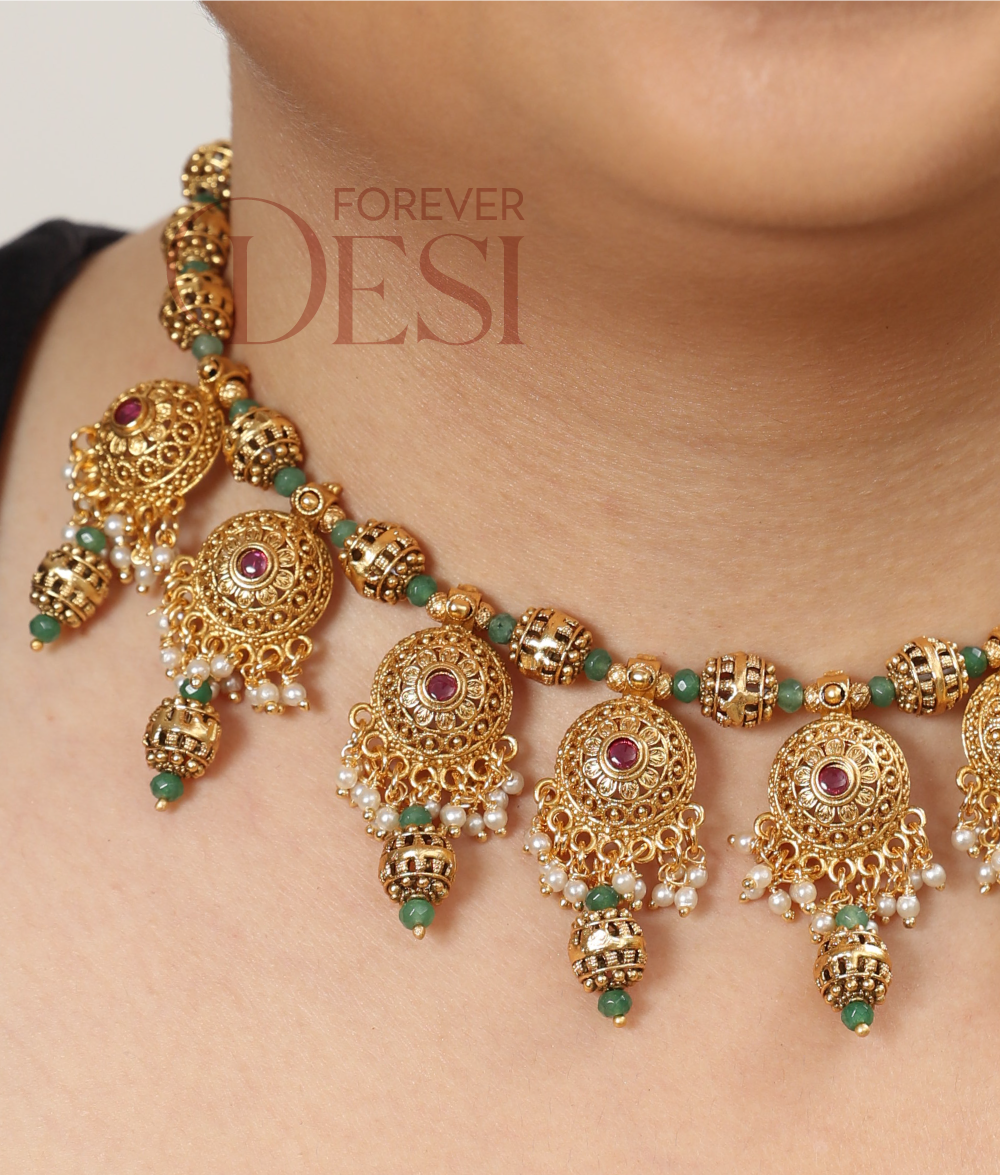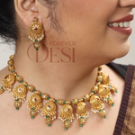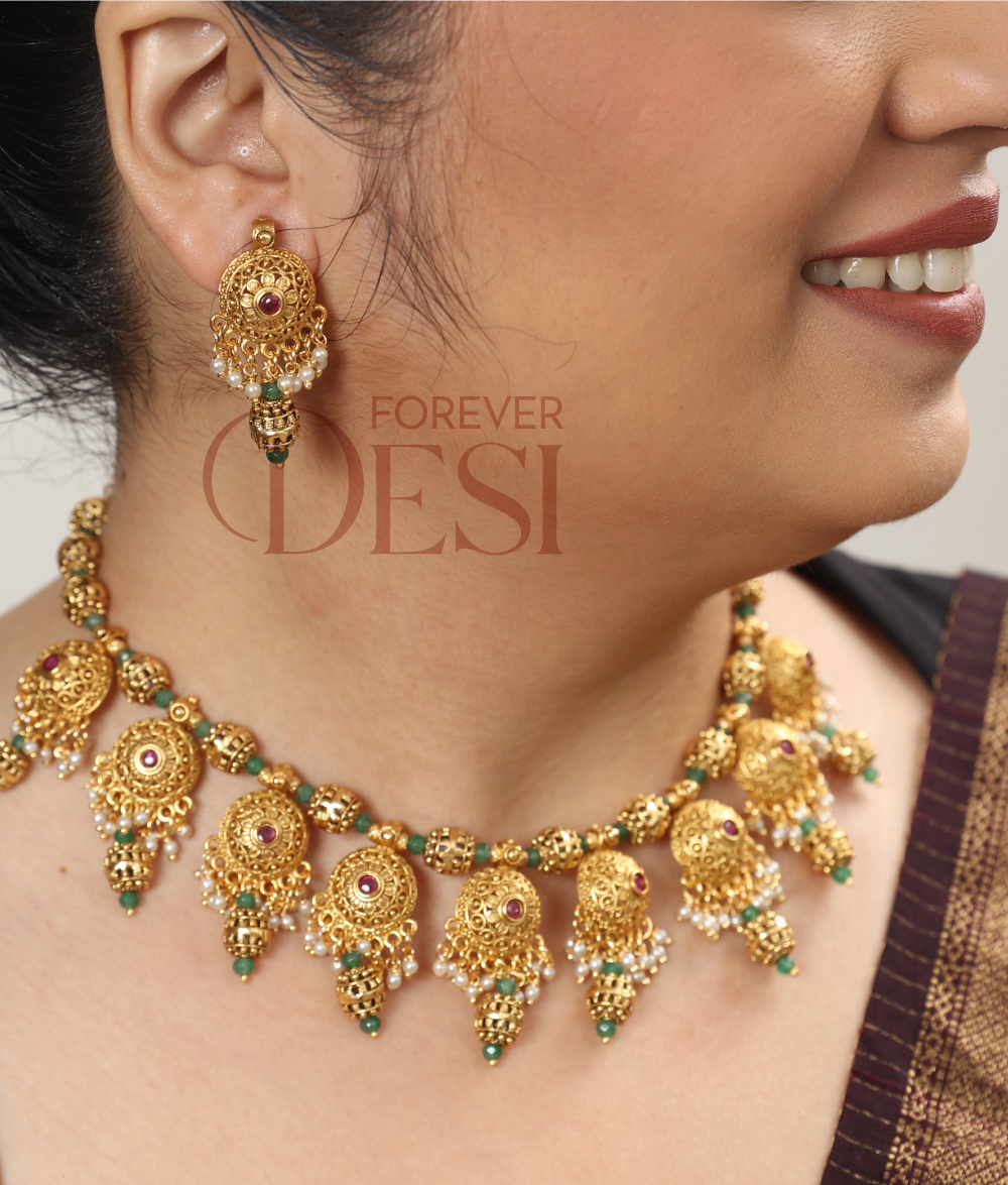 A timeless Vati-style necklace featuring intricately crafted gold-tone pendants inspired by temple motifs, this piece is adorned with delicate pearl and bead drops. The rich detailing and classic structure make it perfect for festive wear, bridal looks, or traditional celebrations. A true heritage piece to elevate your ethnic ensemble.