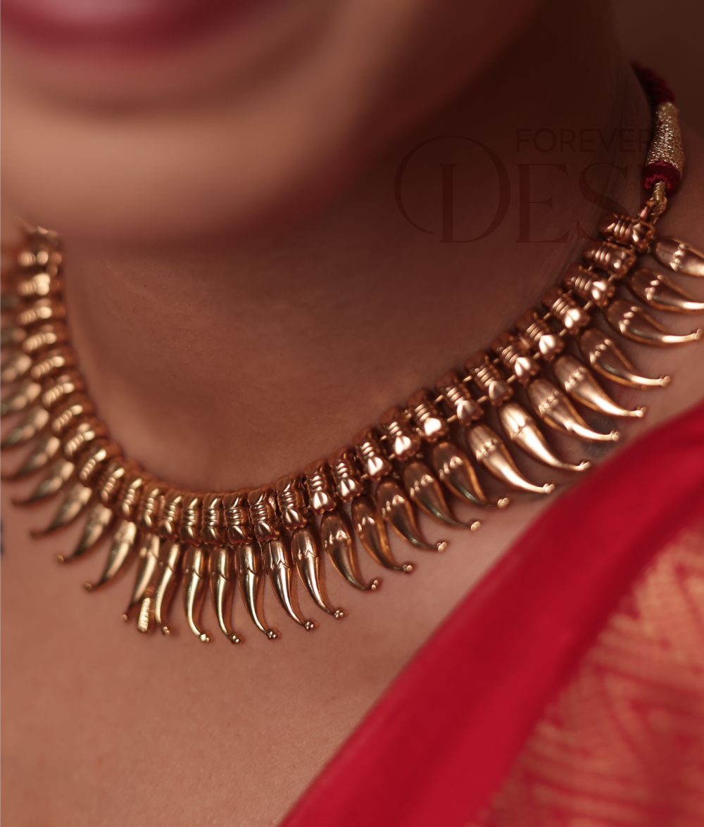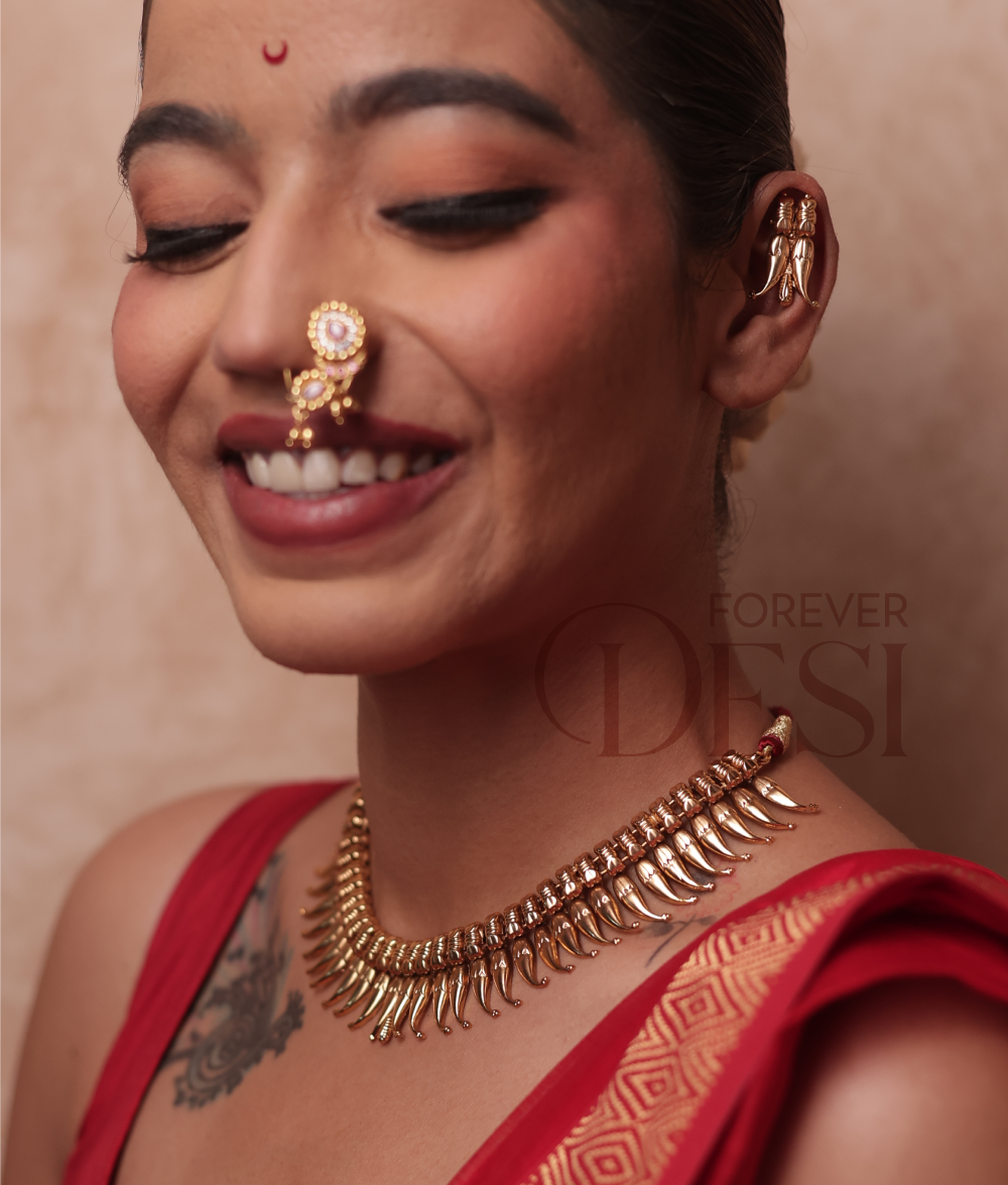 A true symbol of Maharashtrian royalty — the Katyar Necklace features sharp fang-shaped motifs inspired by the traditional dagger design. Handcrafted in gold-toned brass, it carries the strength and grace of warrior queens. Lightweight yet statement-worthy, this necklace pairs beautifully with silk sarees, navvari drapes, or festive fusion outfits.