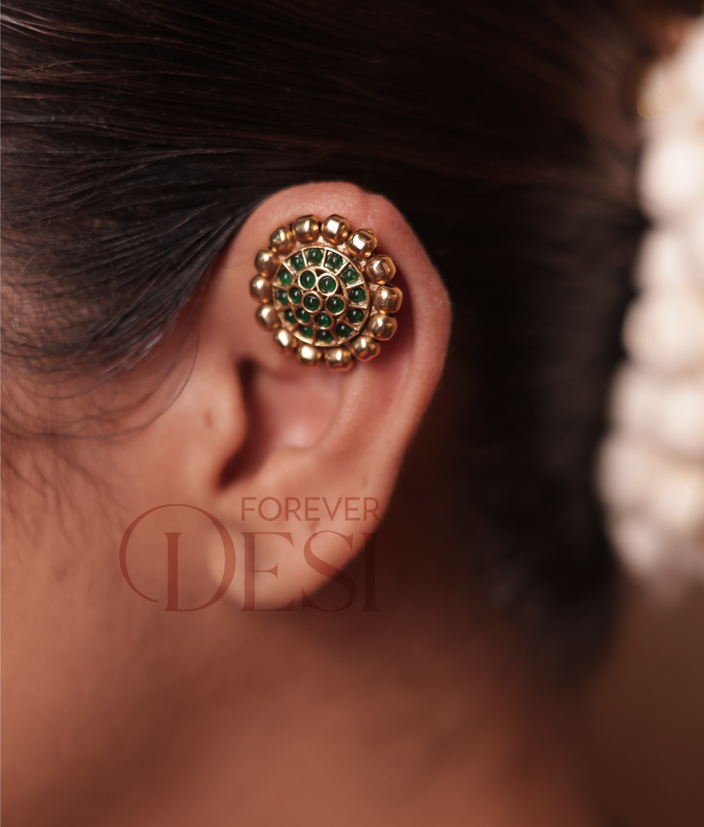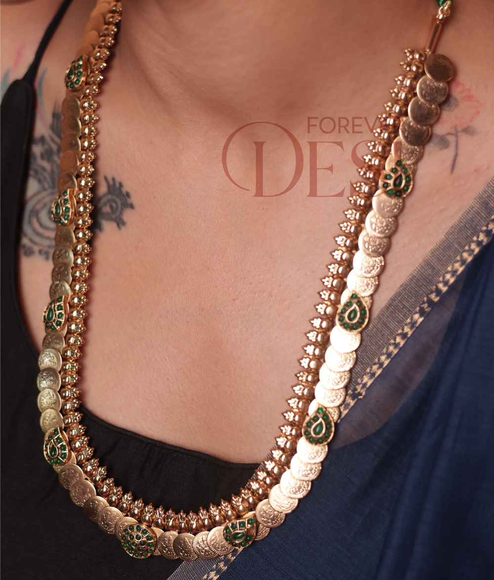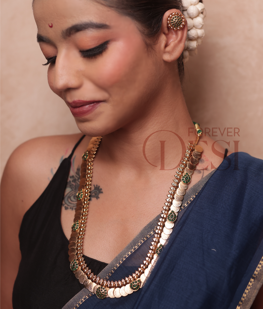 The Lakshmi Coin Haar Set is inspired by the timeless beauty of goddess Lakshmi coins — a symbol of wealth, grace, and blessings. Handcrafted in gold-tone brass with hints of green enamel, this lightweight necklace adds a royal touch to any festive look. A perfect choice for traditional occasions, temple visits, or wedding celebrations. Comes with matching earrings.