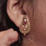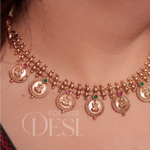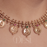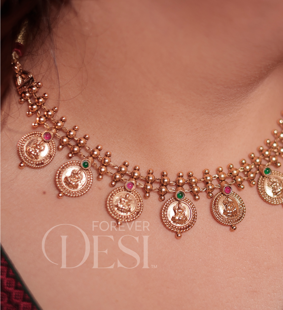 A traditional Shree Lakshmi Coin Thushi crafted in a rich antique gold finish, featuring intricately detailed Lakshmi motifs with delicate bead work. Accented with subtle green and pink stones, this statement piece beautifully blends Maharashtrian heritage with timeless elegance perfect for weddings, festivals.