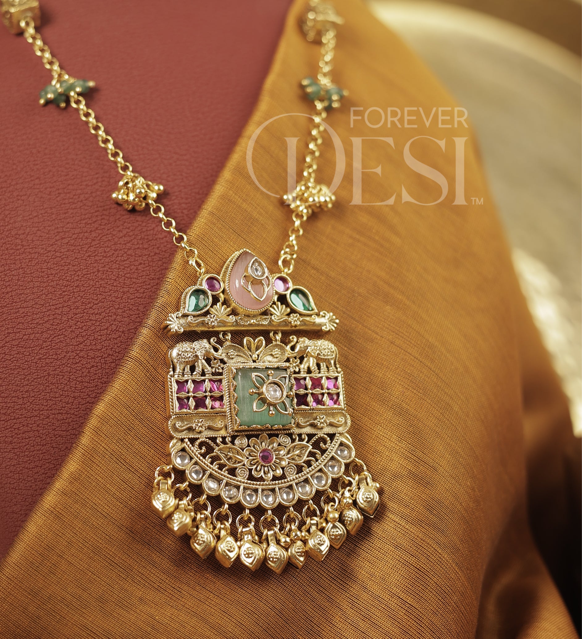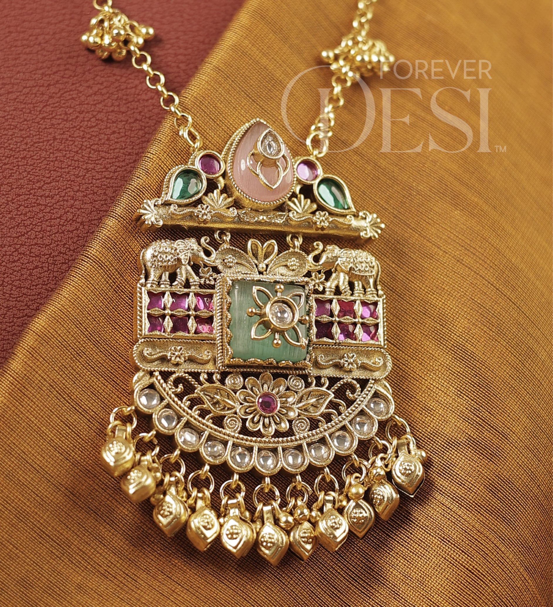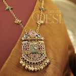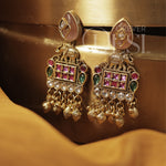 Intricate and full of character, this Peti Heritage Set is crafted in premium brass with a rich gold finish, featuring a detailed pendant inspired by traditional peti designs with fine carvings and layered elements. Accented with ruby, green and kundan-style stones, the piece is further enhanced with delicate hanging bead drops that add beautiful movement.