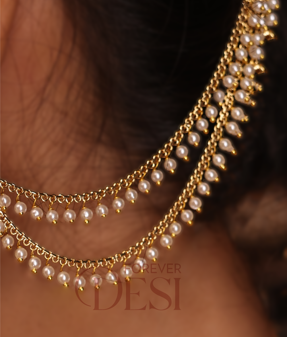 A graceful Kaan Chain featuring two delicate gold-toned layers that drape beautifully along the ear. This traditional design adds a soft shimmer and regal charm to your festive or bridal looks. Lightweight yet eye-catching.