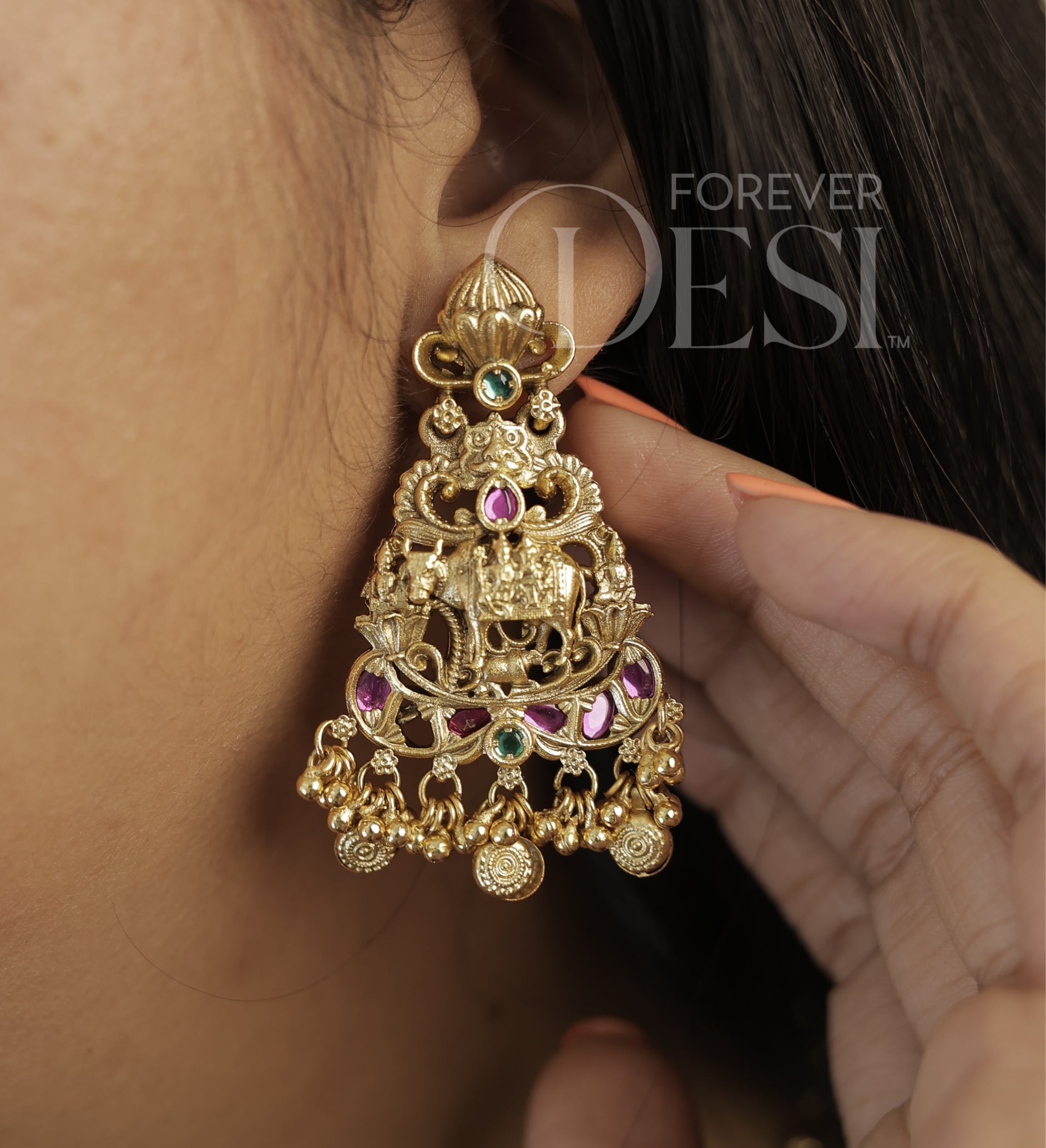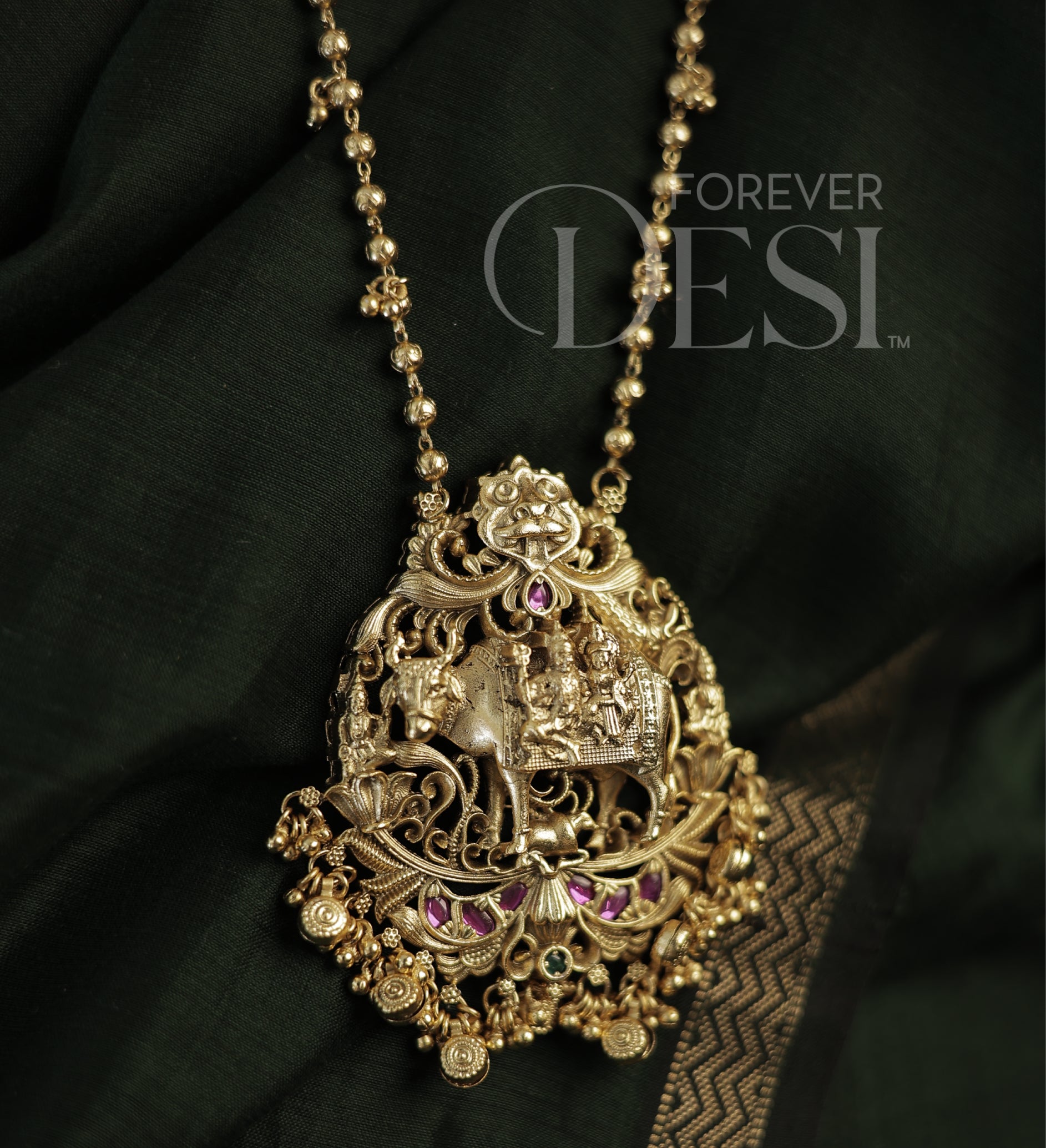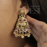 Grand and deeply rooted in tradition, this Shiv Parvati Heritage Set is crafted in premium brass with a rich gold finish, featuring an intricately detailed pendant showcasing divine Shiv-Parvati motifs with fine carvings and temple-inspired elements. Accented with ruby and green-toned stones, along with delicate ghungroo-style drops, the design brings a rich festive presence.