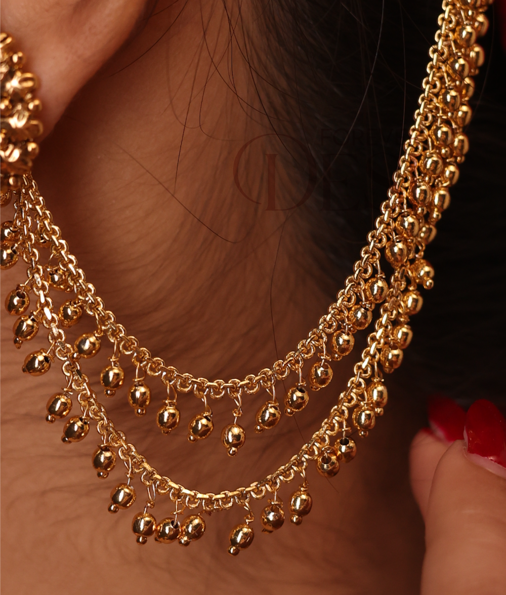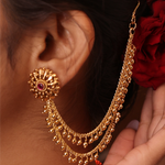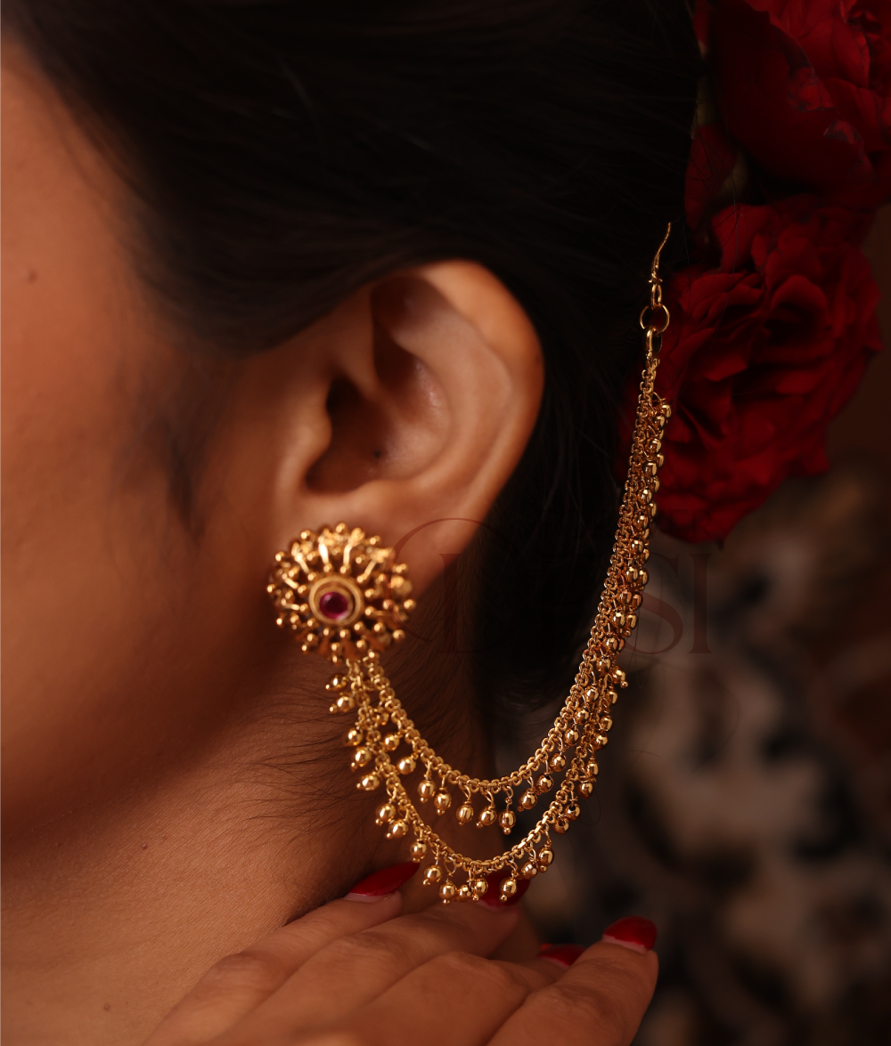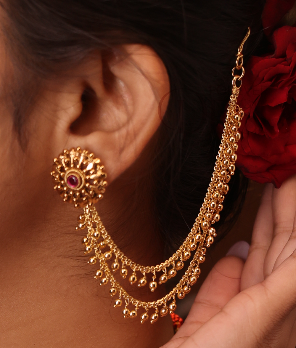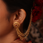 A graceful Kaan Chain featuring two delicate gold-toned layers that drape beautifully along the ear. This traditional design adds a soft shimmer and regal charm to your festive or bridal looks. Lightweight yet eye-catching.
